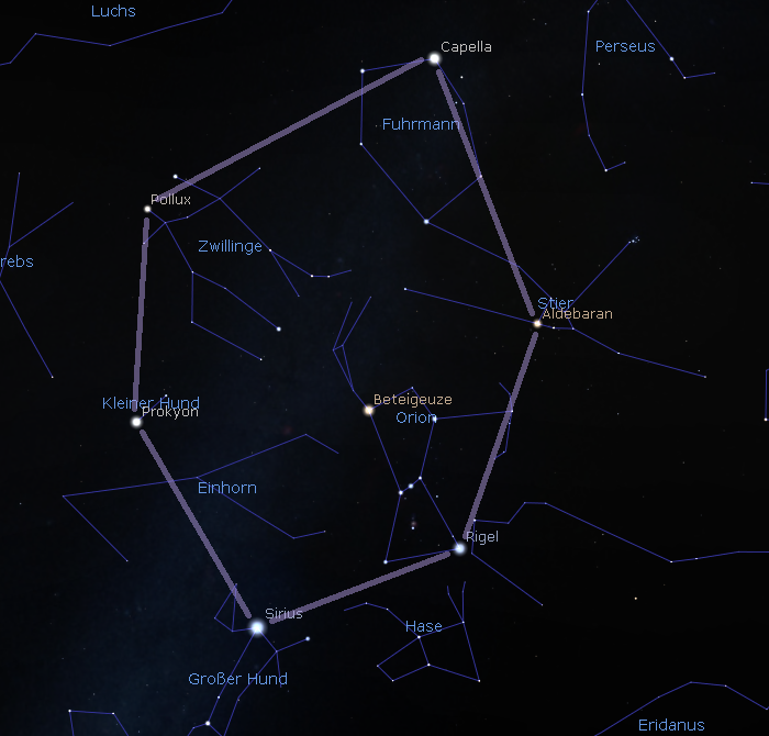 Das Wintersechseck besteht aus den Sternen Capella(Fuhrmann), Aldebaran(Stier), Rigel(Orion), Sirius(Großer Hund), Procyon(Kleiner Hund) und Pollux(Zwillinge). Das Wintersehcseck ist ein Asterismus und somit kein offizielles Sternbild nach IAU.